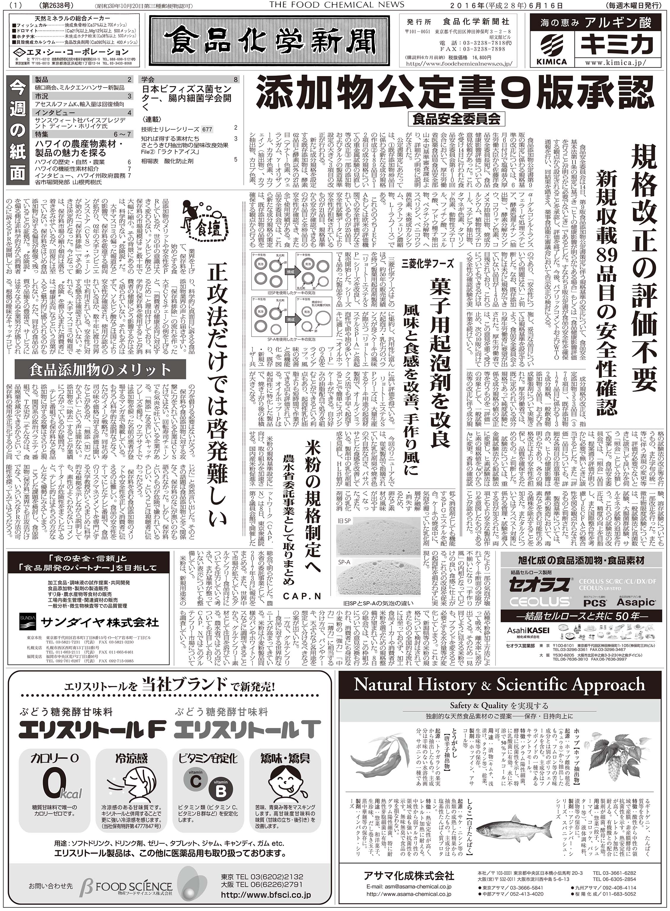 ▽食品安全委員会:添加物公定書9版承認/規格改正の評価不要_新規収載89品目の安全性確認▽三菱化学フーズ:菓子用起泡剤を改良/風味と食感を改善、手作り風に▽CAP.N:米粉の規格制定へ/農水省委託事業として取りまとめ