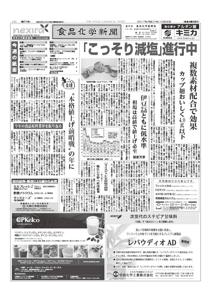 ▽「こっそり減塩」進行中:複数素材配合で効果_カップ麺おいしく4.0以下▽国産天草:伊豆七島半島ともに低水準/相場は高値で値上げ必至▽ヤンマー:「ライスジュレ」本格販売開始/幅広い分野へ応用提案